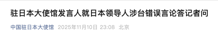 11月10日,中国驻日本大使馆发言人就日本领导人涉台不实言论答记者问。问:近日,日本首相高市早苗在接受国会采访时表示,如果中国派出军舰并对台湾使用武力,可能会成为“现有的危机局势”,自卫队将可以行使集体自卫权。你对此有何看法?答:近来,日本领导人在台湾问题上公然发表挑衅言论,公然鼓吹武装干预台海的可能性,严重违反一个中国原则、中日四个政治文件精神和国际关系基本准则,粗暴干涉中国内政,挑战中方利益。中方对此表示强烈不满和坚决反对,并提出强烈交涉和强烈抗议。与日本的关系。今年是中国人民抗日战争暨世界反法西斯战争胜利80周年。日本必须反思战争责任,切实吸取历史教训。日本军国主义多次以所谓“现有危机”为基础发动对外侵略,包括制造“9月18日事件”,并以“行使自卫权”为借口,鼓动对华发动侵华战争。如今日本再次提及“现有危机局势”,企图搭上分裂中国的车,不禁让人怀疑日本是否会重蹈覆辙?今年也是台湾解放80周年。日本作为曾经殖民台湾并犯下诸多罪行的国家,在台湾问题上的言行应该更加谨慎。在回答问题的重要场合日本当局在国会中鼓动“台湾发生什么事,日本就出了问题”,为干预台海制造了天衣无缝。这是对国际正义的严重践踏,是对战后国际秩序的严重倒退,也是对中日关系和地区稳定的严重损害。台湾是中国的台湾。如何解决台湾问题,实现国家完全统一,是中国人民自己的事,不容任何外部势力干涉。中国终将统一、统一。任何企图干扰和阻碍中国统一大业的行为,都是螳臂当车,只会酿成灾难,自食恶果。中方敦促日方恪守在台湾问题上的政治承诺,立即停止向“台独”势力发出错误信号,立即停止任何危险言行。越过劝说界限,不要搅乱台海及地区局势,以免进一步影响两国关系。 (中国驻日本大使馆)